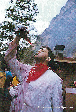 If you would like to participate in a real wet Spanish "fiesta" you should try to go to Haro, La Rioja, 29th of June in the morning. At that date a procession takes place in the streets of the town. At the head is the mayor on horseback with a banner and following him are the citizens of Haro, all dressed in white with red scarfs. They are carrying jugs, bottles, carboys and what ever you can fill with wine.